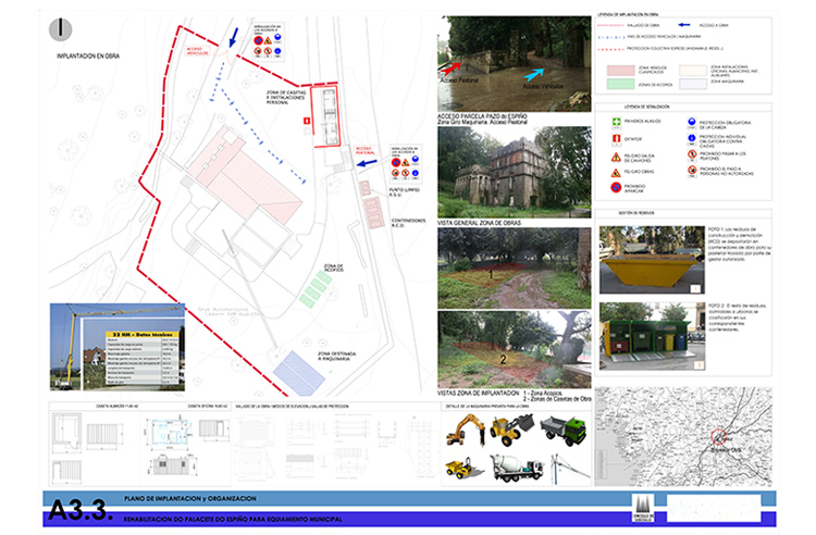 Acompañando a la memoria de ejecución del concurso, se realizarán Planos de Implantación realizados en AutoCAD, donde se representará, bajo la decisión y supervisión del cliente, la mejor ubicación para la implantación los medios auxiliares, campamento de obra, zona de acopios, recorridos, accesos a la obra, y las medidas de seguridad oportunas, todo ellos con el fin de justificar en mayor medida la estrategia de actuación de las obras en estudio.